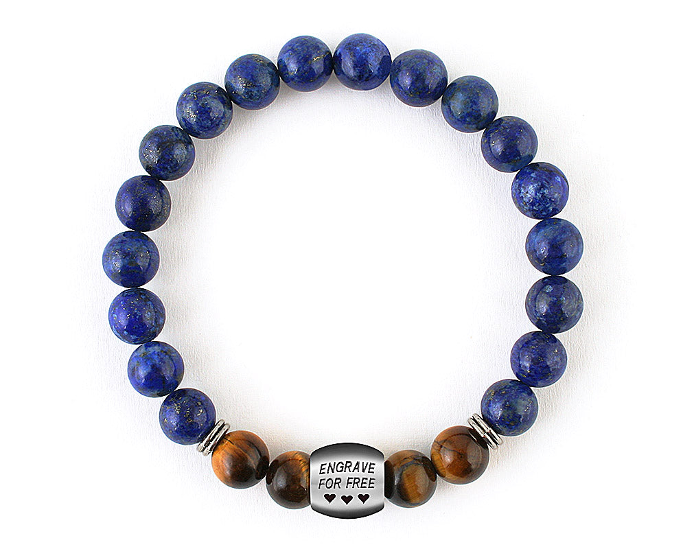 This men’s bracelet made with natural 8 mm lapis lazuli beads, natural 8 mm tiger beads and stainless steel focal bead for engraving.