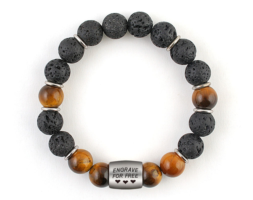 This men’s bracelet made with natural 10 mm black lava beads, natural 10 mm tiger beads and silver plated focal bead for engraving.